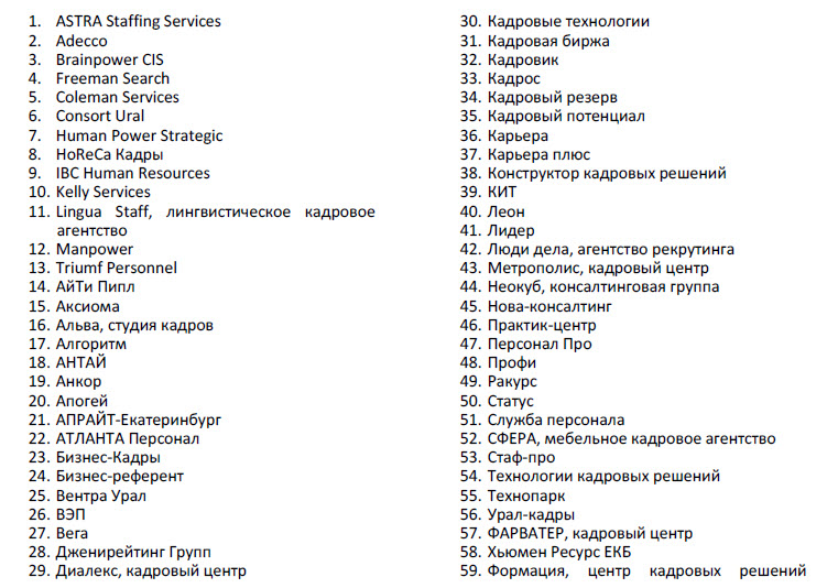 Перечень агентств, которые действуют в Екатеринбурге и оказывают услуги по подбору персонала: