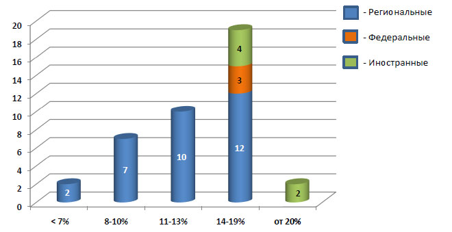 Если взять укрупненно, то видно, что чуть более половины компаний предлагают услуги стоимостью от 14 до 20 % от годового дохода, вторая половина работает в сегменте 7–13 % от годового дохода.